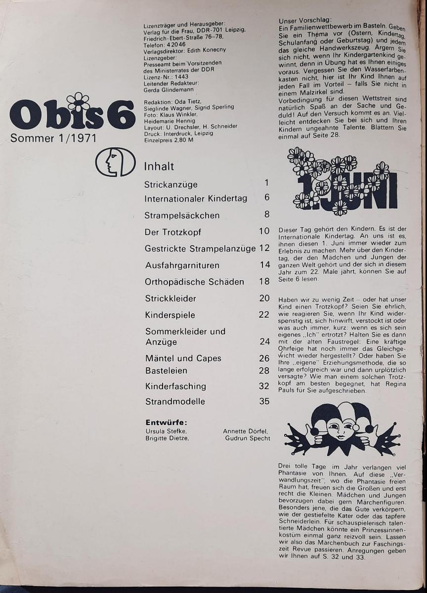 Bemerkung: Sommer 1, Verlagsdirektor: Edith Konecny, Lizenzgeber: Presseamt beim Vorsitzenden des Ministerrates der DDR, Telefon: 42046, Foto: Klaus Winkler, Heidemarie Hennig, Layout: U. Drechsler, H. Schneider