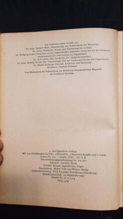 Bemerkung: Dieses Lehrbuch erhalte ich leihweise von der Schule. Ich verpflichte mich, es sofort einzubinden und sorgfältig zu behandeln, damit es im nächsten Jahr auch der ausgeliehen werden kann. Bei schlechter Behandlung muß das Lehrbuch entzogen bezw. bezahlt werden. Mit 157 Abbildungen im Text, 3 Farbtafeln, 4 Kunstdrucktafeln und 2 Tafeln. Einband: Günther Klaus, Vorsatz: Roland Jäger/Rainer Zieger, Ausstattung: Atelier Volk und Wissen, Berlin