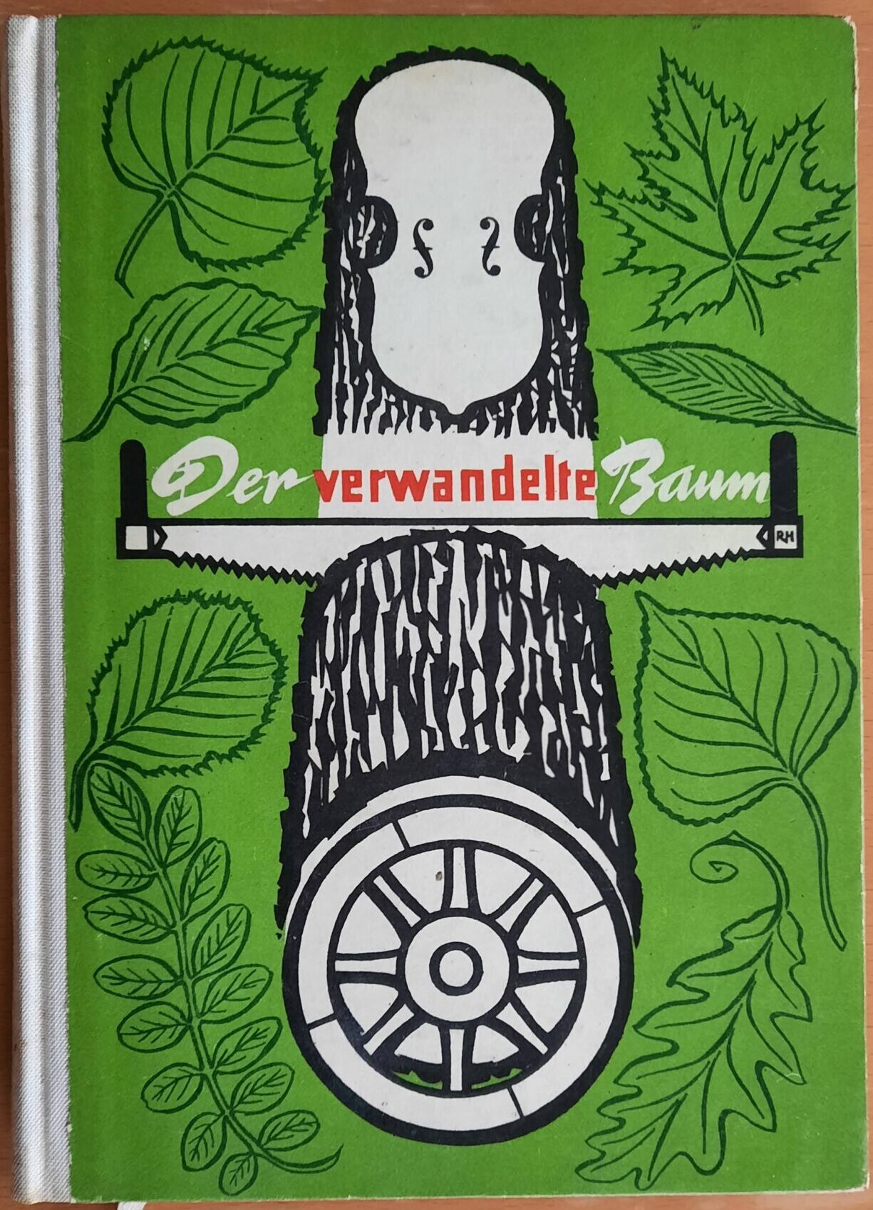 Einband: Die grafische Gestaltung des Hardcovers von Ruprecht Haller visualisiert den Titelgedanken durch eine stilisierte Schrotsäge, die einen Baumstamm in Kultur- und Wirtschaftsgüter (Geigenholz und Wagenrad) teilt.