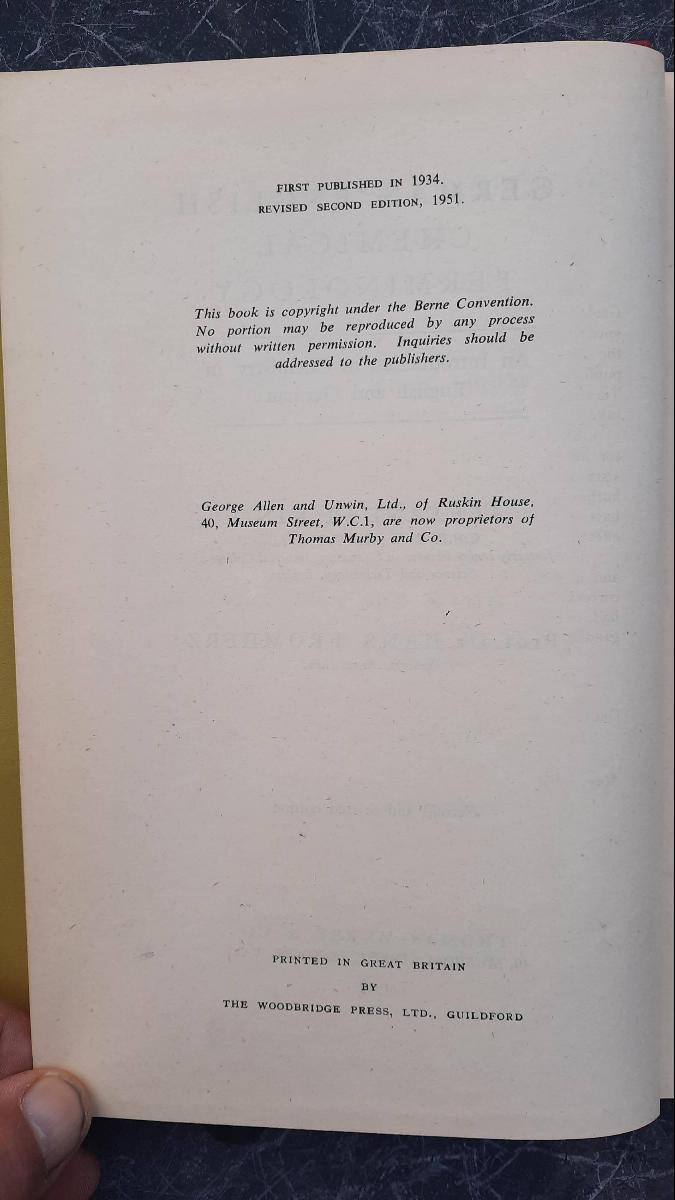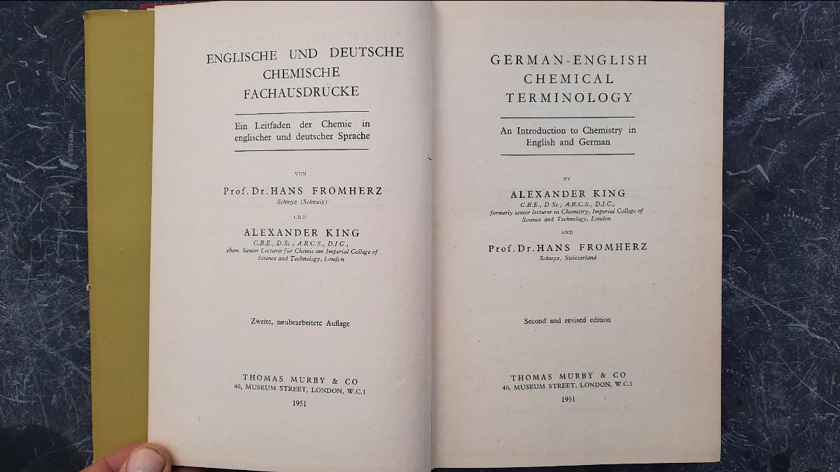 Bemerkung: Prof. Dr. HANS FROM HERZ: Schwyz (Schweiz)/Switzerland, ALEXANDER KING: C.B.E., D.Sc., A.R.C.S., D.I.C., ehem. Senior Lecturer für Chemie am Imperial College of Science and Technology, London/formerly senior lecturer in Chemistry, Imperial College of Science and Technology, London. George Allen and Unwin, Ltd., of Ruskin House, 40, Museum Street, W.C.1, are now proprietors of Thomas Murby and Co.