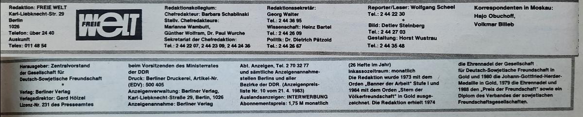 Bemerkung: ISSN 0427-5217. Ausgabe 19/1989. Abonnementspreis: 1,75 M monatlich (26 Hefte im Jahr). Die Redaktion wurde 1973 mit dem Orden „Banner der Arbeit“ Stufe I, 1984 mit dem Orden „Stern der Völkerfreundschaft“ in Gold, 1974 mit der Ehrennadel der Gesellschaft für Deutsch-Sowjetische Freundschaft in Gold, 1980 mit der Johann-Gottfried-Herder-Medaille in Gold, 1979 mit der Ehrennadel und 1988 mit dem „Preis der Freundschaft“ sowie einem Diplom des Verbandes der sowjetischen Freundschaftsgesellschaften ausgezeichnet.