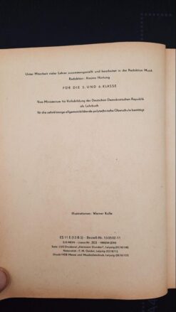 Bemerkung: Unter Mitarbeit vieler Lehrer zusammengestellt und bearbeitet in der Redaktion Musik. Für die 5. und 6. Klasse. Vom Ministerium für Volksbildung der Deutschen Demokratischen Republik als Lehrbuch für die zehnklassige allgemeinbildende polytechnische Oberschule bestätigt.