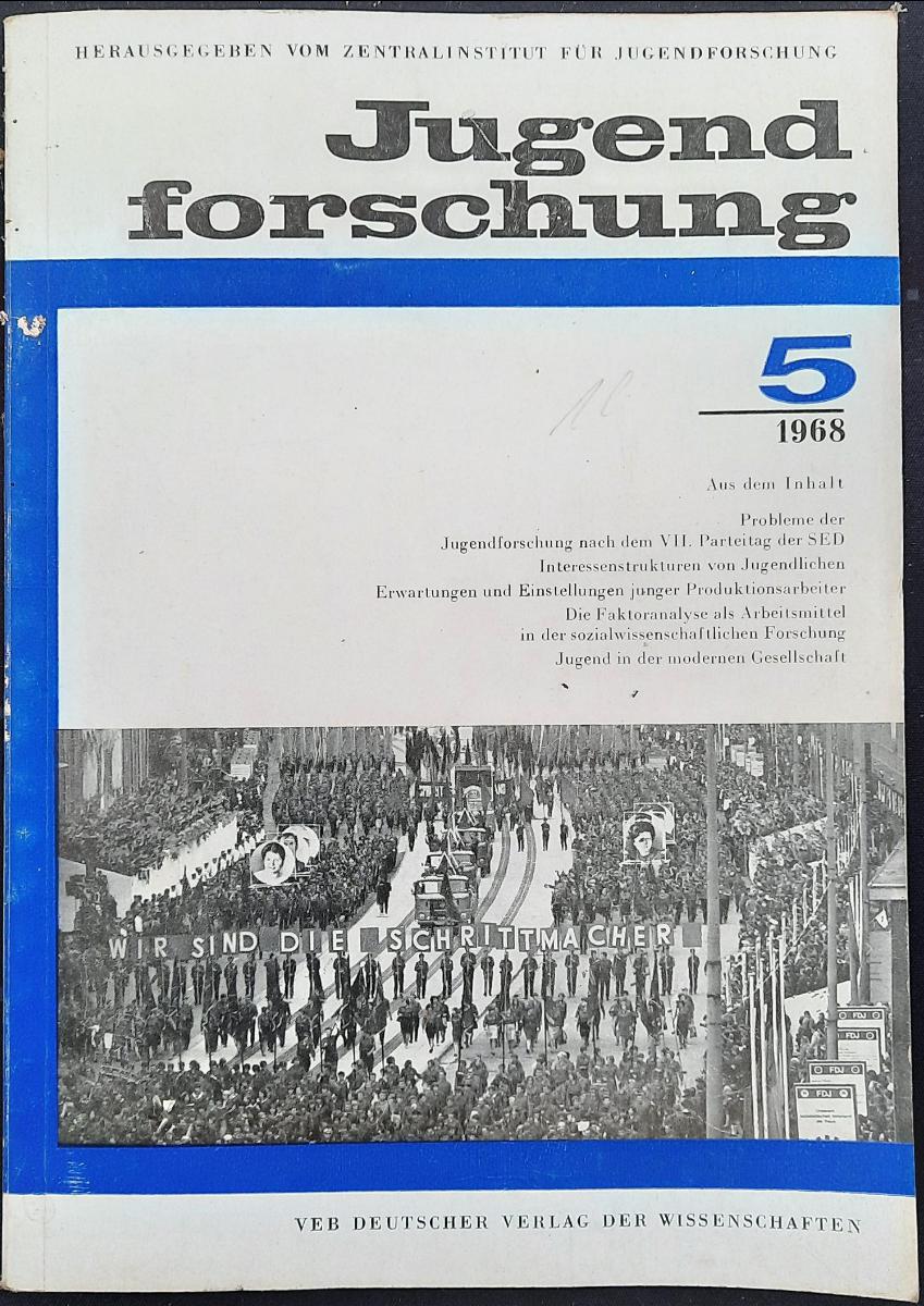 Jugendforschung 5/1968 ist eine Zeitschrift der renommierten Schriftenreihe zur marxistischen Jugendforschung und Jugenderziehung, herausgegeben vom Zentralinstitut für Jugendforschung der DDR. Das Werk erschien im Jahr 1968 im VEB Deutscher Verlag der Wissenschaften in Berlin – eine zentrale Verlagsadresse für sozialwissenschaftliche Literatur der DDR. Zielgruppe sind Fachleute aus Forschung, Erziehung, Bildung und Politik, die sich für die Bedingungen, Herausforderungen und die planmäßige Förderung der Jugend im Sozialismus interessieren.