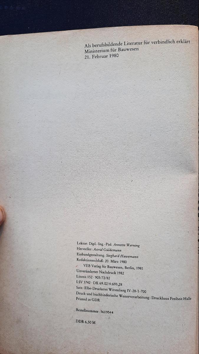 Bemerkung: Mit 86 Abbildungen und 32 Tabellen, Als berufsbildende Literatur für verbindlich erklärt (Ministerium für Bauwesen, 21. Februar 1980), Printed in GDR, Unveränderter Nachdruck 1982, DK 69.02/4:693,28
