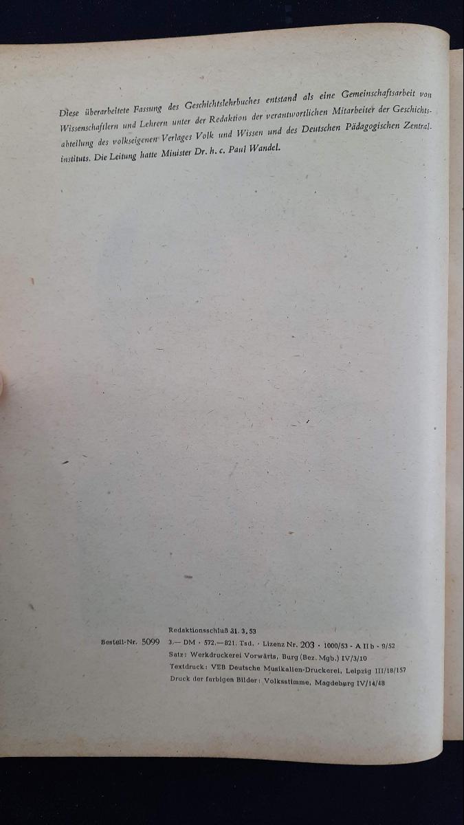 Bemerkung: Diese überarbeitete Fassung des Geschichtslehrbuches entstand als eine Gemeinschaftsarbeit von Wissenschaftlern und Lehrern. Die Leitung hatte Minister Dr. h. c. Paul Wandel. (Druckauflage: 572.-821. Tsd.)
