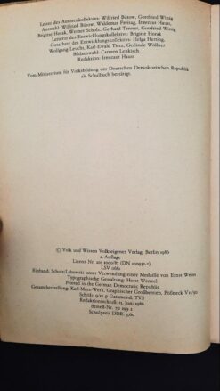Bemerkung: Vom Ministerium für Volksbildung der Deutschen Demokratischen Republik als Schulbuch bestätigt. Einband: Schulz/Labowski unter Verwendung einer Medaille von Ernst Weiss. Typographische Gestaltung: Horst Wenzel. Printed in the German Democratic Republic.