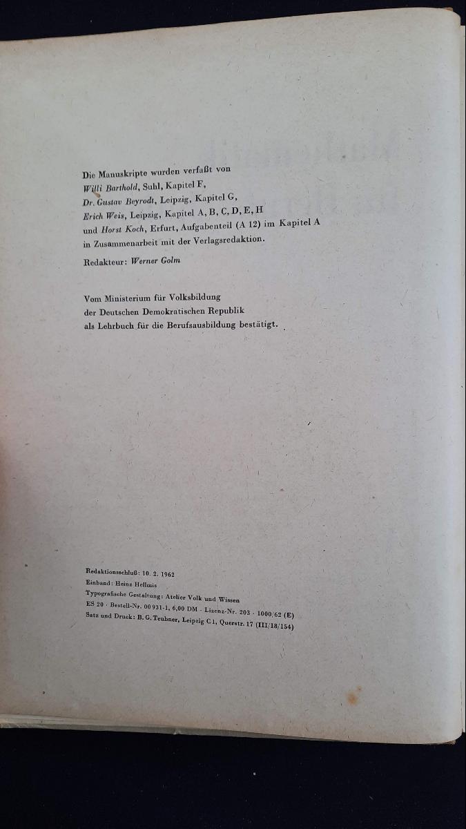 | Bemerkung | Vom Ministerium für Volksbildung der Deutschen Demokratischen Republik als Lehrbuch für die Berufsausbildung bestätigt. |