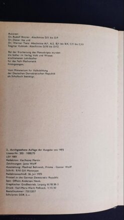 Bemerkung: Vom Ministerium für Volksbildung der Deutschen Demokratischen Republik als Schulbuch bestätigt. Bei der Erarbeitung des Manuskripts wurden die bisher im Verlag Volk und Wissen erschienenen Lehrbücher für das Fach Mathematik hinzugezogen.