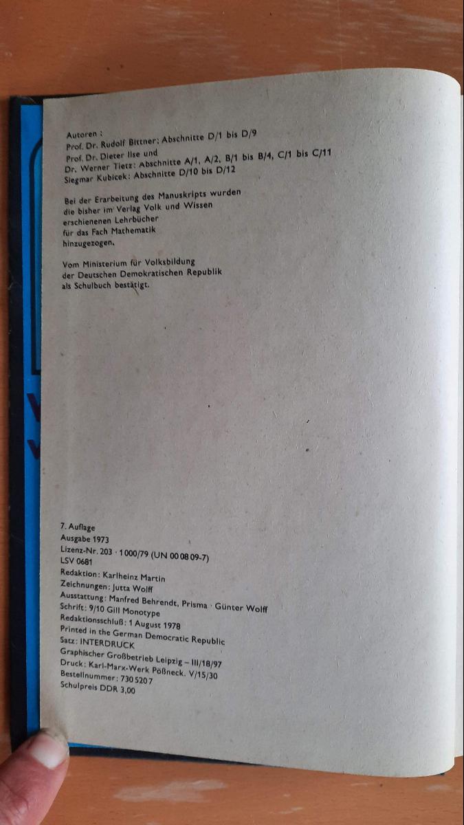 Bemerkung: Vom Ministerium für Volksbildung der Deutschen Demokratischen Republik als Schulbuch bestätigt., Bei der Erarbeitung des Manuskripts wurden die bisher im Verlag Volk und Wissen erschienenen Lehrbücher für das Fach Mathematik hinzugezogen.