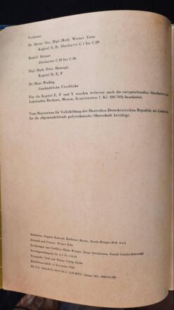 Bemerkung: Für die Kapitel E, F und Y wurden teilweise auch die entsprechenden Abschnitte des Lehrbuches Rechnen, Messen, Konstruieren 7. Kl. (00 709) bearbeitet. Vom Ministerium für Volksbildung der Deutschen Demokratischen Republik als Lehrbuch für die allgemeinbildende polytechnische Oberschule bestätigt. Einband und Vorsatz: Werner Fahr. Typografie: Volk und Wissen Verlag Berlin.