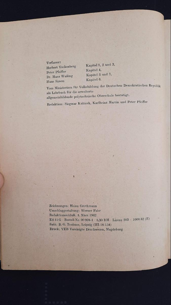 Besonderheiten: Karl Mittag auf Innentitel aufgeführt ohne explizite Rollenzuschreibung, Autorenbeiträge nach Kapiteln aufgeteilt: Herbert Vockenberg (Kapitel 1, 2 und 3), Peter Pfeiffer (Kapitel 4), Dr. Hans Wuẞing (Kapitel 5 und 7), Hans Simon (Kapitel 6), Innentitel: Kl.9b/1, Impressum: ES 11 G, 1000/62 (E), Satz: (III-18-154).