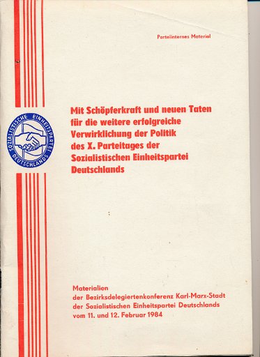 DDR-Heft, Parteiinternes Material, Materialien der Bezirksdelegiertenkonferenz Karl-Marx-Stadt der DES vom 11. und 12. Februar 1984 – geringe Gebrauchs- und Altersspuren – Kante an der Heftung gering berieben und bestoßen-leichte Knickspuren am Einband