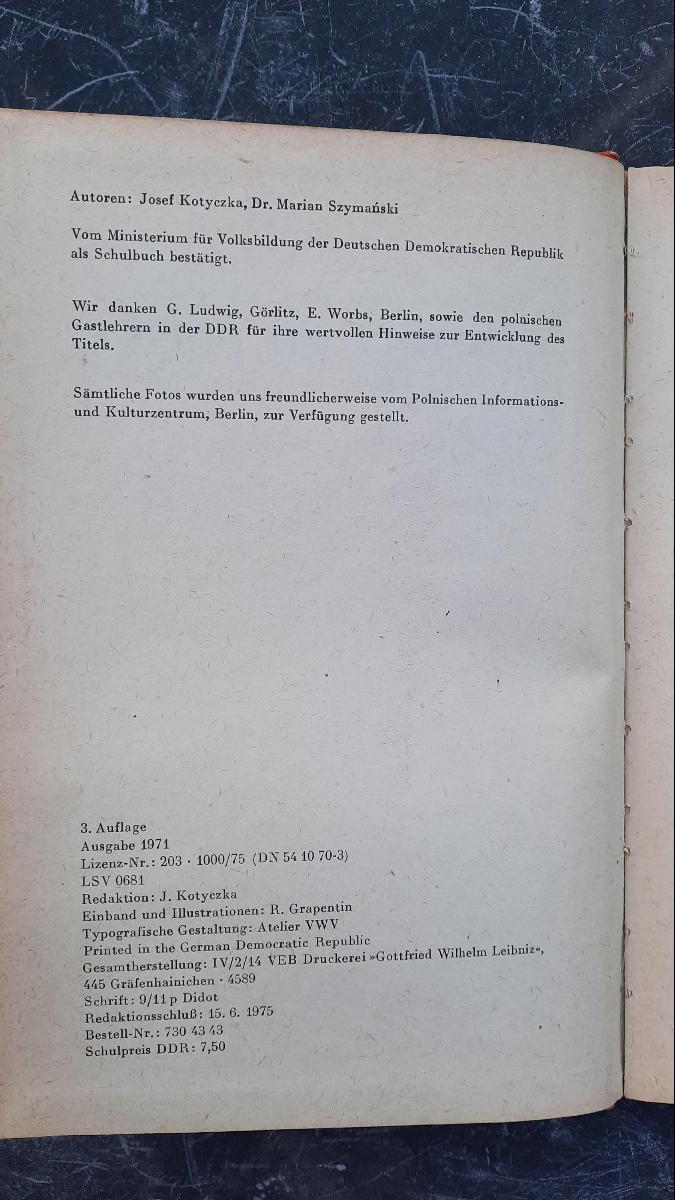 Bemerkung: Vom Ministerium für Volksbildung der Deutschen Demokratischen Republik als Schulbuch bestätigt. Wir danken G. Ludwig, Görlitz, E. Worbs, Berlin, sowie den polnischen Gastlehrern in der DDR für ihre wertvollen Hinweise zur Entwicklung des Titels. Sämtliche Fotos wurden uns freundlicherweise vom Polnischen Informations- und Kulturzentrum, Berlin, zur Verfügung gestellt. Typografische Gestaltung: Atelier VWV. Printed in the German Democratic Republic.