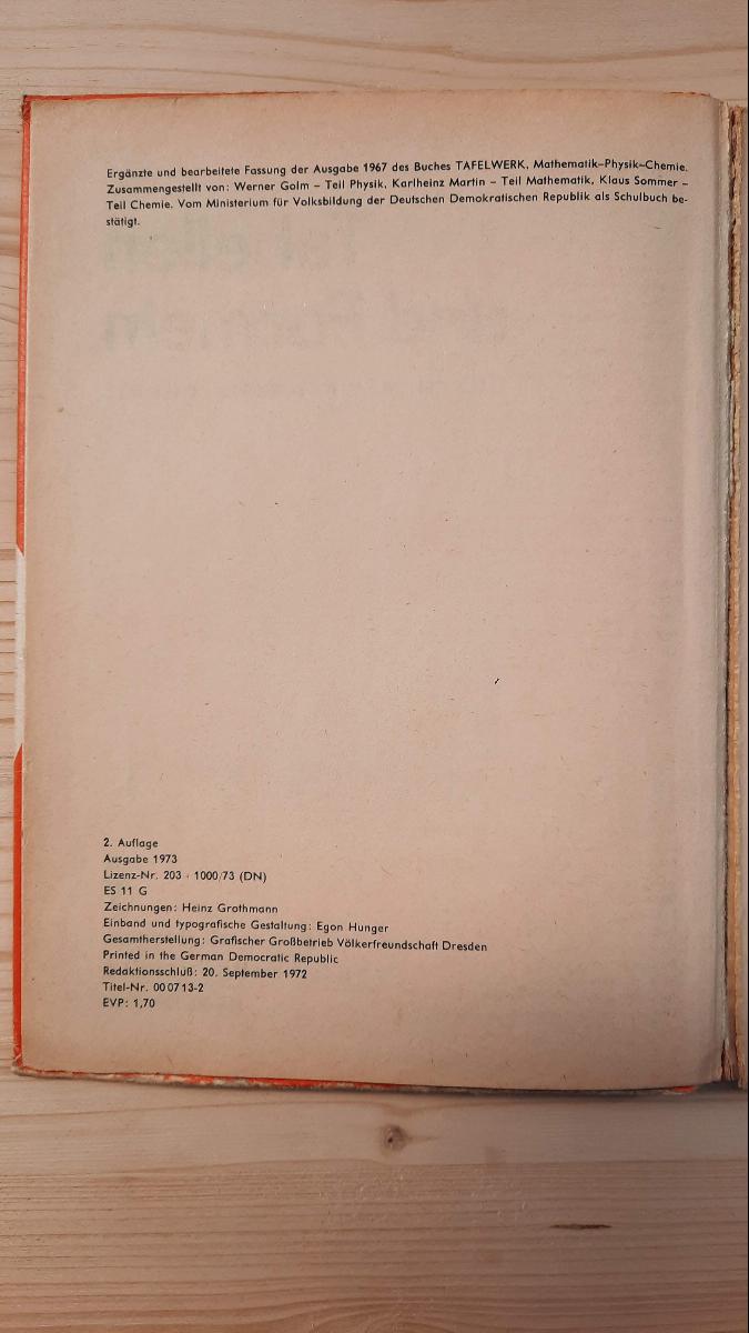 Bemerkung: Ergänzte und bearbeitete Fassung der Ausgabe 1967 des Buches TAFELWERK, Mathematik-Physik-Chemie. Vom Ministerium für Volksbildung der Deutschen Demokratischen Republik als Schulbuch bestätigt.