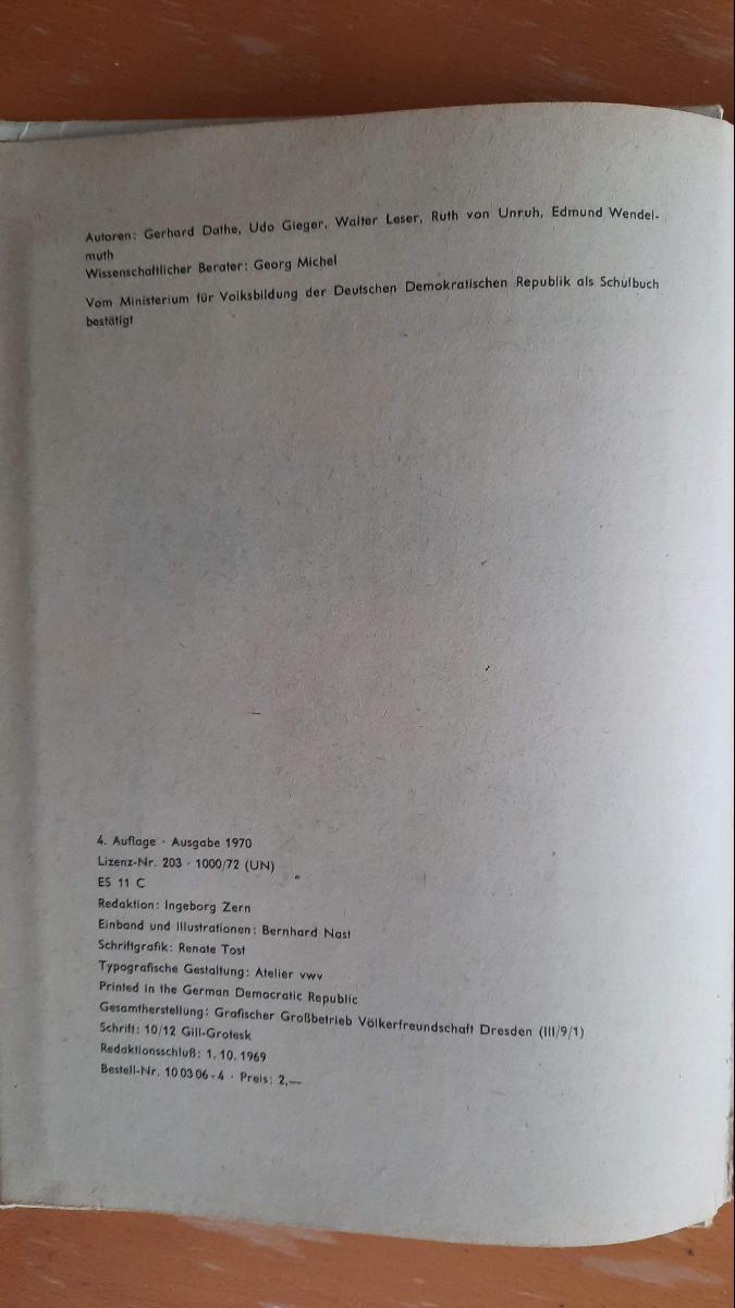 Bemerkung: Wissenschaftlicher Berater: Georg Michel, Vom Ministerium für Volksbildung der Deutschen Demokratischen Republik als Schulbuch bestätigt, Ausgabe 1970, ES 11 C, Schriftgrafik: Renate Tost, Typografische Gestaltung: Atelier vwv, Printed in the German Democratic Republic, muth
