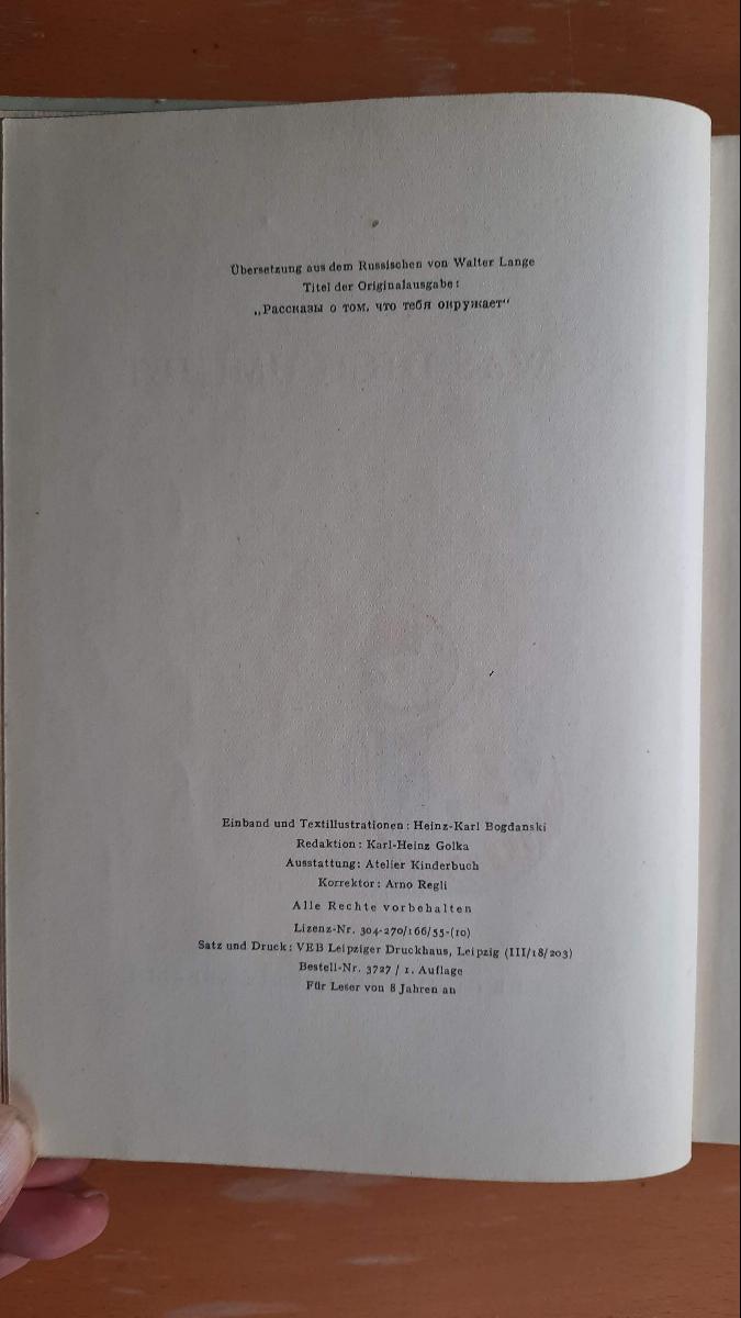 Bemerkung: Übersetzung aus dem Russischen von Walter Lange. Titel der Originalausgabe: ,,Рассказы о том, что тебя окружает“. Korrektor: Arno Regli. Ausstattung: Atelier Kinderbuch.