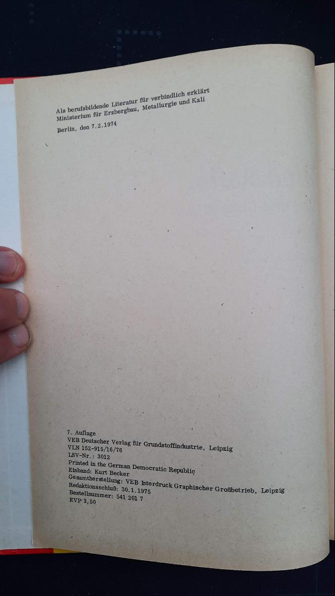 Bemerkung: Als berufsbildende Literatur für verbindlich erklärt Ministerium für Erzbergbau, Metallurgie und Kali Berlin, den 7.2.1974. Printed in the German Democratic Republic. Einband: Kurt Becker.