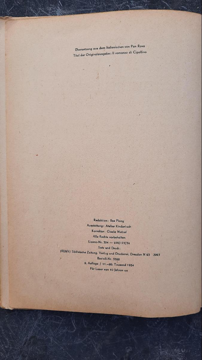 Bemerkung: Übersetzung aus dem Italienischen von Pan Rova, Titel der Originalausgabe: Il romanzo di Cipollino, Ausstattung: Atelier Kinderbuch, Korrektor: Gisela Wetzel